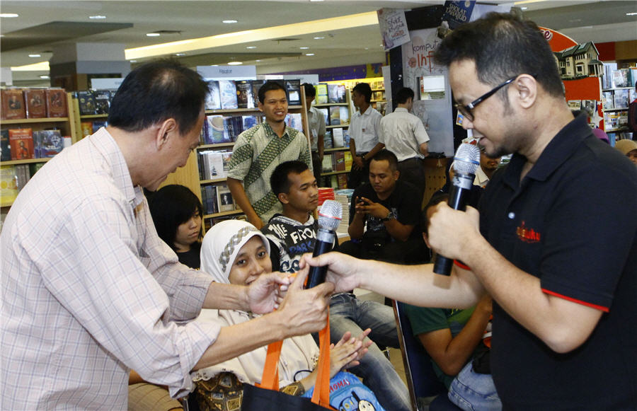Walhasil, acara peluncuran yang saya bayangkan akan mengulik proses kreatif para penulis secara lebih mendalam, akhirnya berjalan biasa saja—walaupun tetap menarik. Selain ketiadaan musik yang mengiringi acara, antusiasme peserta terhadap karya yang tengah dibahas juga tidak terlalu kuat. Terbukti dari pertanyaan-pertanyaan yang muncul (menurut saya) bukan jenis pertanyaan yang bisa menggali potensi buku yang merangkum 33 kisah pendek tersebut. Ketika moderator akan membuka sesi bertanya dan setiap penanya dijamin akan memperoleh bingkisan dari penerbit, segeralah lima orang mengacungkan tangan. Tapi menilik materi pertanyaannya, selain lelaki bercelana tiga perempat itu :D, para penanya tampak sekadar ingin menyabet hadiah yang dijanjikan.