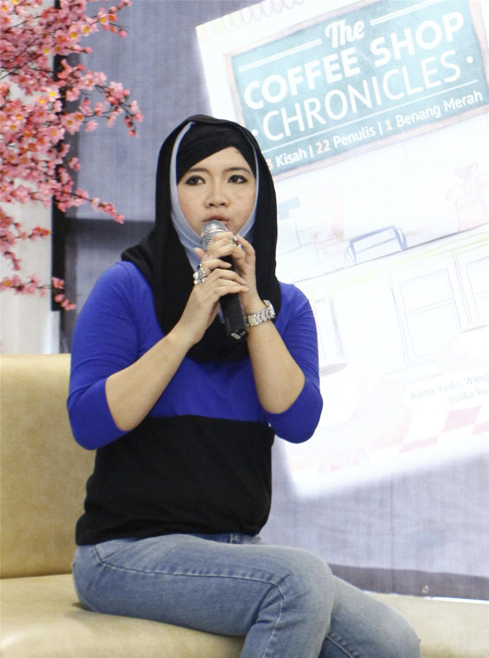 Ternyata acara peluncuran buku telah dimulai, dan suara yang beberapa saat sebelumnya terdengar adalah suara moderator acara. Kami terlambat beberapa puluh menit. Ketika mengambil tempat duduk, kami melihat sembilan penulis duduk berderet di depan—tengah diwawancarai oleh moderator. Sayang sekali, moderator tidak berhasil menghadirkan ‘interogasi’ yang cantik terhadap para penulis karena ia (lucunya) belum membaca isi buku yang tengah diluncurkan. Ia memang terlihat memegang satu kopi buku TCSC, tapi mata saya jelas menangkap bahwa buku itu masih rapi terbalut kemasan plastik. Dia sendiri pun secara gentle mengaku bahwa ia belum membaca himpunan kisah dalam TCSC dan berjanji akan segera membacanya. Bukankah sudah terlambat? 😦