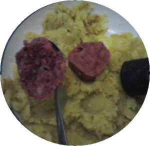 4. Begitu kentang tuntas dilumat halus, masukkan kornet sapi dan aduk hingga merata. (Saya cuma pake separuh kaleng biar irit; itung-itung proyek coba-coba. Secara daging kan mahal sob! 😀 )