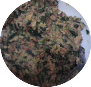 5. Masukkan bayam yang sudah direbus sebentar. Masukkan pula irisan daun bawang agar adonan lebih sedap. Agar lebih harum, saya sempat kepikiran membubuhkan daun jeruk purut yang dicacah halus. Tapi jangan sampe Anda berpikir untuk menambahkan daun pintu ya sebab dijamin bisa merontokkan gigi saat perkedel dikunyah hehe.. 🙂 Ceplokkan sebutir telur dan curahkan juga sebungkus bumbu penyedap, lalu aduk lagi sampai adonan kalis dan menyatu.