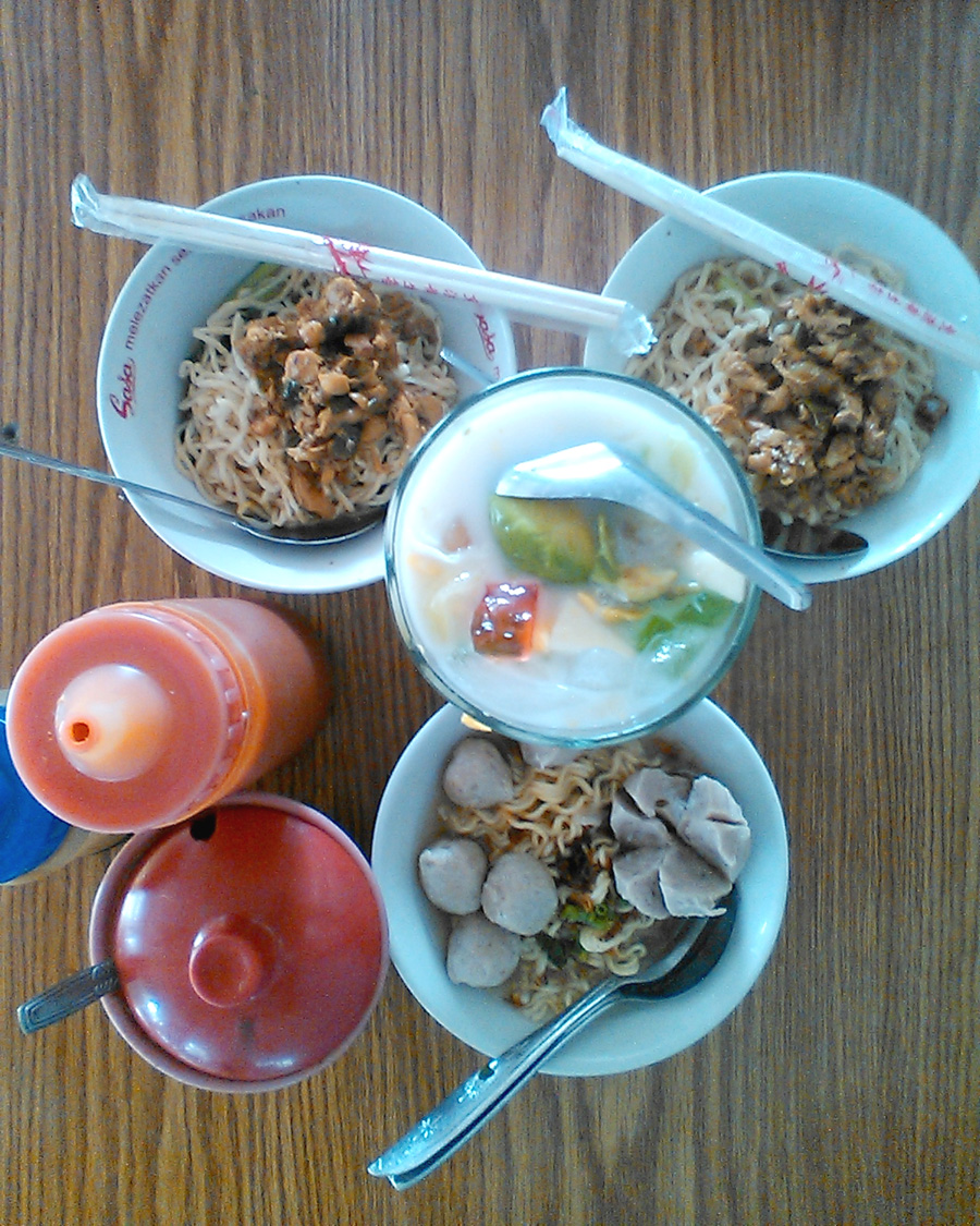 Beberapa hari kemudian, kami melipir ke sebuah kedai es dan sop buah tak jauh dari Waterpark Marcopolo yang kondang itu. Di depan sebuah minimarket terdapat lapak makanan dan minuman. Kami memesan bakso, mi ayam, dan es buah. Seorang teman yang tinggal di kompleks ini kebetulan pernah merekomendasikan soal sop buah yang enak.