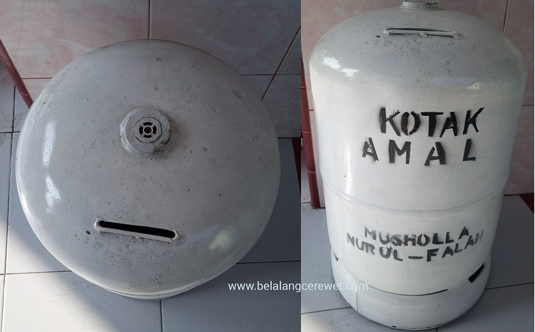 Turun di Babat, saya lalu berjalan kaki ke selatan sambil menanti bus ke arah Jombang. Alasan utama sebenarnya hendak mencari toilet umum yang baru saya temukan di sebuah musholla agak jauh dari palang rel kereta api. Sebelum menempuh perjalanan 1,5 jam, saya mesti memastikan tidak ingin BAK selama berada di bus sebab tak mungkin tersedia kamar mandi di atas. Saat hendak meninggalkan musholla, mata tertumbuk pada kotak amal yang unik sebab terbuat dari tabung gas yang lazimnya diisi LPG untuk menyuplai energi saat memasak. Unik banget nih jadi bikin pengunjung merogoh kantong untuk nyemplungin sesuatu ke dalamnya.