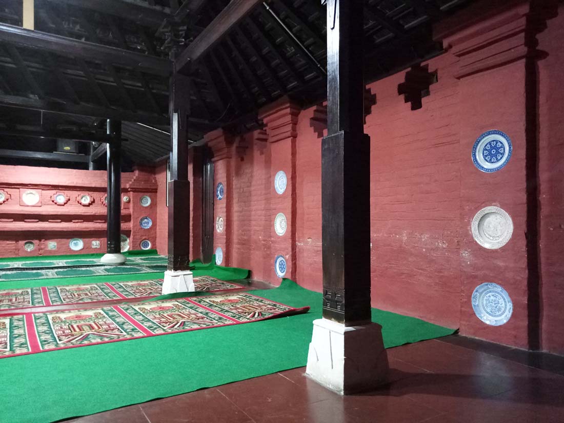 Syukurlah, Grab enggak rewel lagi. Langsung deh pesan untuk cus ke masjid tujuan. Tiba di sana pas masuk waktu Isya karena sebelumnya salah masjid yang menurut pengojek Grab benar seperti yang saya mau. Saya ingat betul bentuk dan suasana masjidnya dari blog post Uni Evi yang juga pernah ke masjid itu sebelumnya. Akhirnya saya bisa shalat di sana dan mengambil beberapa jepretan suasana masjid, terutama dinding masjid yang mencerminkan akulturasi Cina dan Jawa.