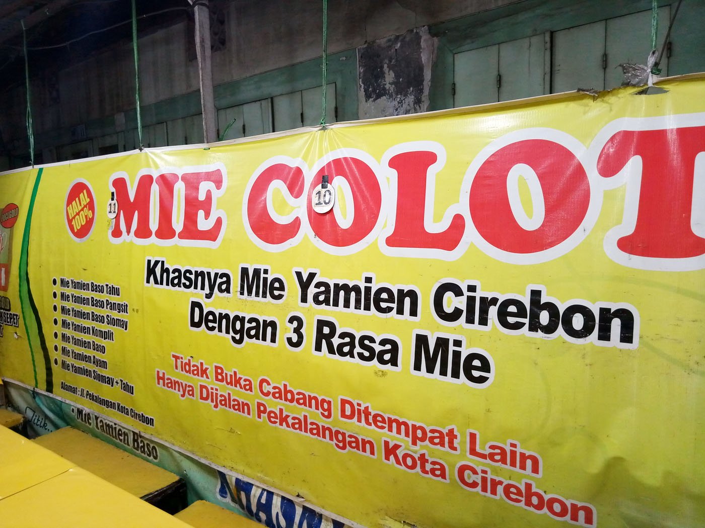 Begitu masjid berangsur sepi, saya turut undur diri karena perut tergoda mencicipi mi colot khas Cirebon. Sebenarnya saat makan siang saya berjanji tak akan makan malam, setidaknya bukan berbahan karbo. Kelezatan empal paru rasanya masih bertahan lama di lidah. Namun harap maklum, makan siang hanya dipasok dengan sebungkus kecil nasi jamblang, padahal rata-rata saya lihat pengunjung yang datang ke kedai itu memesan minimal dua porsi.