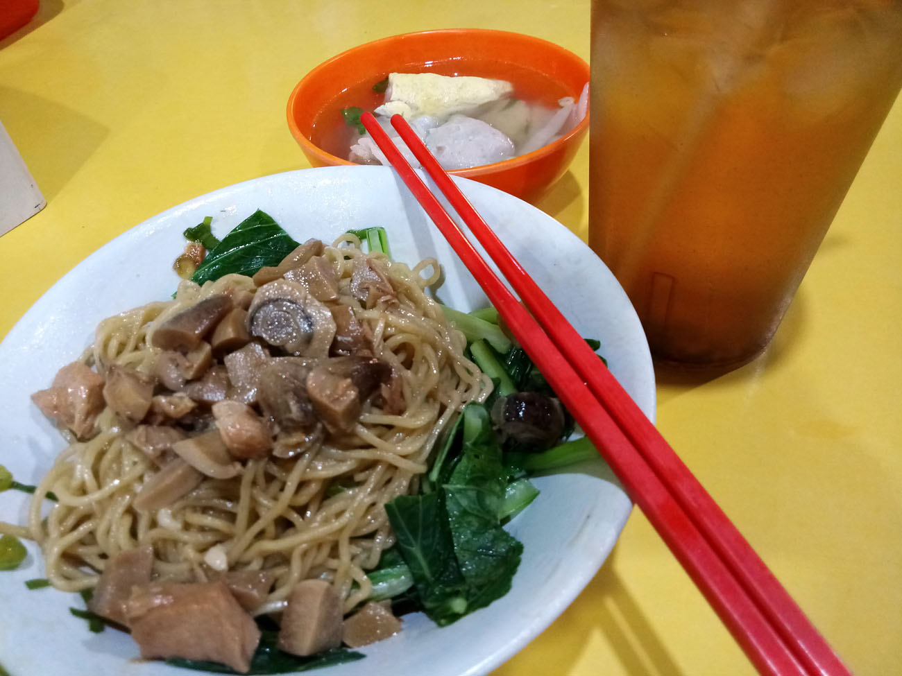 Saya tahu mi colot dari browsing. Setelah bertanya lagi kepada Google, lokasi terdekat mi colot ternyata hanya dalam radius 300 meter. Maka saya pun berjalan sampai ke kedai pinggir jalan itu. Selain irit, anggap aja jogging malam, hehe. Tiba di tempat, saya langsung pesan paket lengkap plus es teh tawar tentu saja. Saya kurang tahu mi colot ini sebenarnya jenis masakan ataukah jenis mi yang disajikan. Yang jelas, mi yaminnya enak dan mengenyangkan.