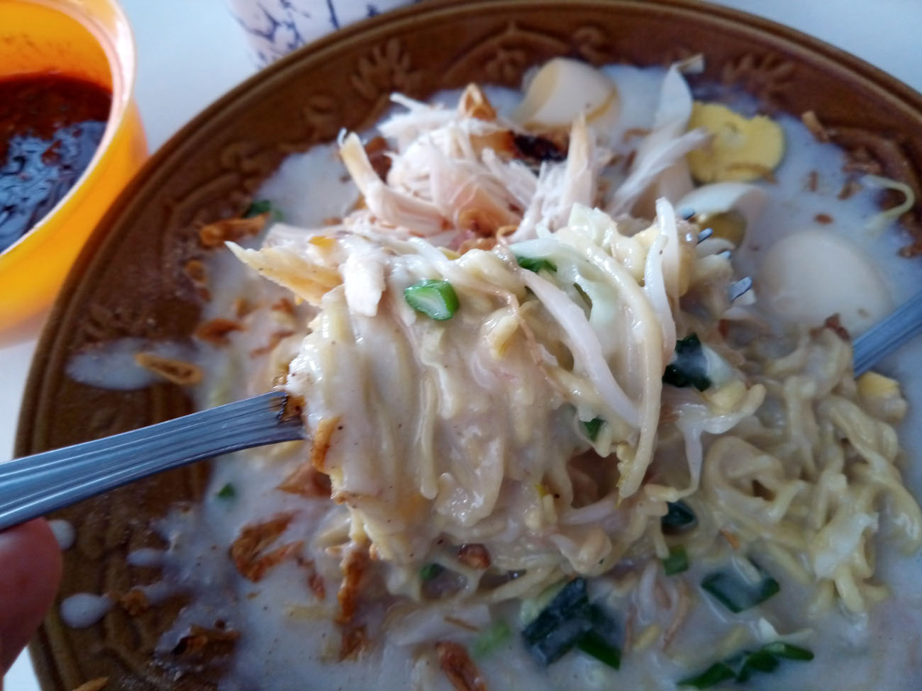 Selepas shalat Zuhur, Mbak Tira mengusulkan agar saya mencoba mi koclok. Malam sebelumnya, beberapa saat setelah saya menyantap mi colot, Doel aka Rizki bloger Jakarta membocorkan info tentang adanya mi koclok enak di sekitar Masjid Merah Panjunan. Pucuk dicinta ulam tiba. “Kalau saya sih suka ya, engga tahu kalau Mas!” ujar Mbak Tira mengomentari mi koclok yang disajikan sedikit mblenyek akibat kehadiran maizena. Karena penasaran, saya pun menyambut usulannya. Abang Grab langsung mengantar kami ke daerah Tanda Dalam kalau tak salah, tepat berada di belakang Masjid At-Taqwa yang megah itu.
