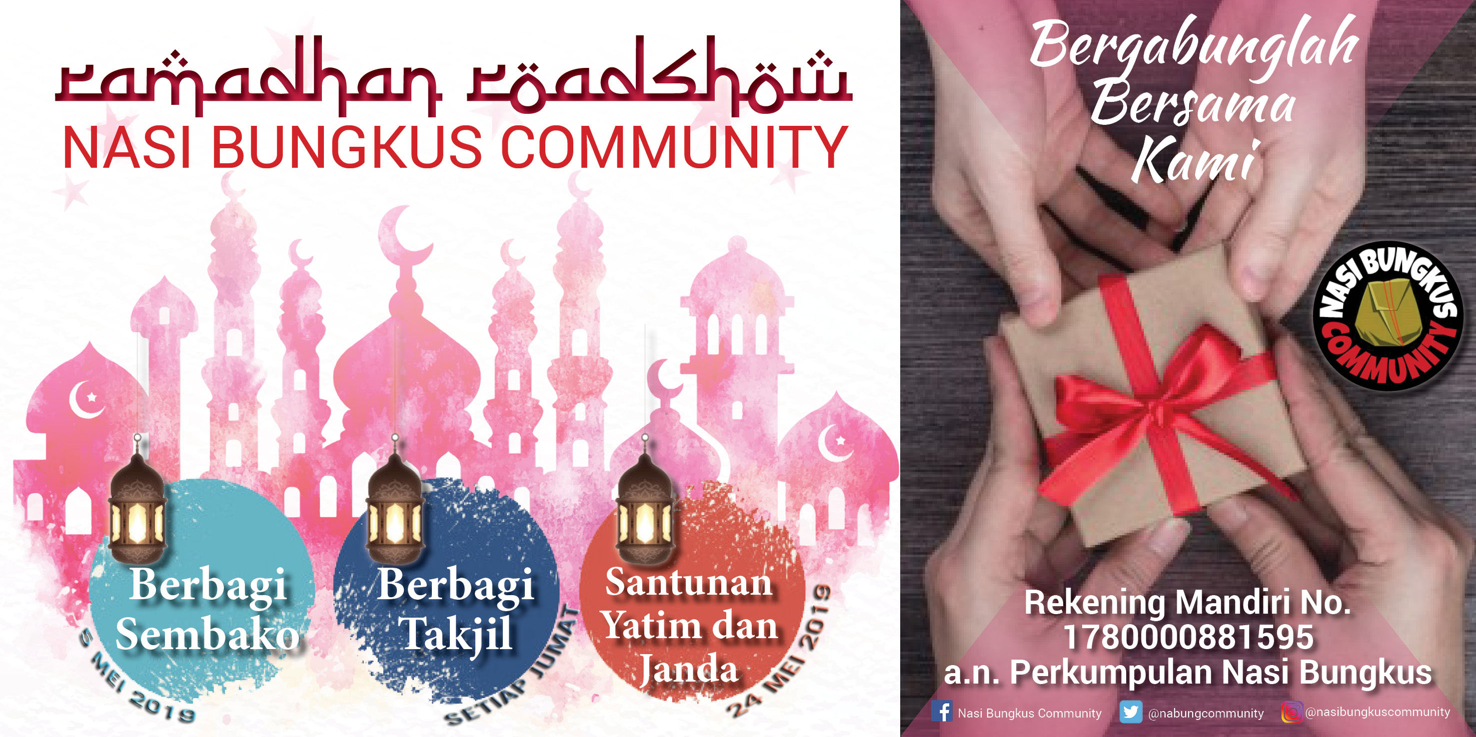 Kedua, skill mendesain saya pergunakan untuk membuat banner atau pamflet guna mendukung kegiatan sosial. Saat ini saya berhimpun di NBC atau Nasi Bungkus Community yang kegiatannya tak hanya berbagi nasi bungkus, tapi juga mengadakan santunan bagi anak yatim dan duafa, membuka Omah Ngaji, berbagi takjil dan buka puasa, berbagi air saat kemarau panjang, dan tentu saja menggalang donasi untuk Iduladha lalu membagikan dagingnya. Semua ini butuh media penyebaran informasi dan salah satunya melalui banner (untuk kegiatan offline) dan pamflet untuk disebar di media sosial. Alhamdulillah saya kebagian mendesain walaupun tidak mendesainnya from the scratch atau dari nol—melainkan modifikasi atau digabung-gabung dari desain free yang sudah ada.