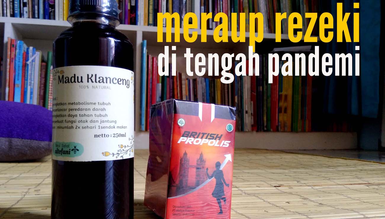 Selama pandemi, saya pun ikut memanfaatkan peluang guna meraup rezeki dengan menjual suplemen, yakni madu murni dan propolis. Produk yang saya jual merupakan hasil kerja sama dengan seorang teman. Madu hadir dalam tiga kemasan: madu manis, madu klanceng, dan madu bawang lanang. Madu manis seharga Rp45.000 per 250 ml berasal dari pohon randu dan masih raw alias mentah tanpa pasteurisasi atau pengawet. Madu klanceng seharga Rp55.000 per 250 ml berasal dari lebah trigona yang tidak menyengat, tetapi mengigit. Madu klanceng dihasilkan oleh lebah ternak yang mencari makanan sendiri.