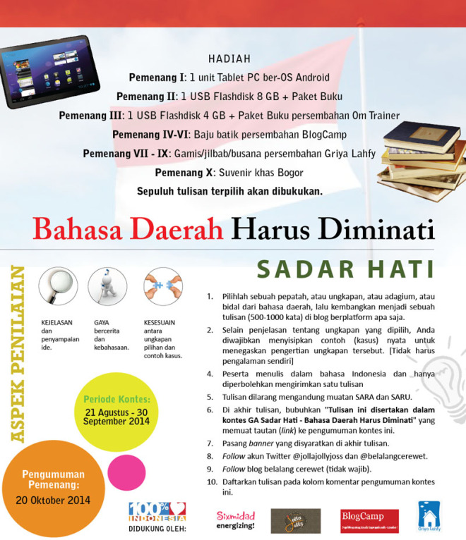 Tahun 2014 saya menghelat kontes di blog ini yang terbilang sukses besar untuk ukuran blog personal. Entah karena daya pikat hadiah berupa tablet PC atau karena pesona temanya, ratusan entri masuk didaftarkan sebagai partisipasi dalam lomba tersebut. Selain berjibun peserta yang menyerbu lomba, saya girang bukan kepalang karena ternyata para bloger masih akrab dengan bahasa pribumi yang melahirkan mereka.