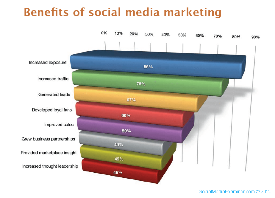 SocialMediaExaminer.com merilis data menarik Mei 2020 lalu. Dari 5.200 digital marketer yang disurvei, sebesar 86% menyatakan bahwa optimasi di media sosial ternyata mampu meraih exposure untuk bisnis mereka. Trafik pun meningkat sebesar 78%, sangat signifikan. Setidaknya separuh dari marketer tersebut mengaku bahwa penjualan produk meningkat berkat pemanfaatan media sosial untuk menyebarkan usaha.