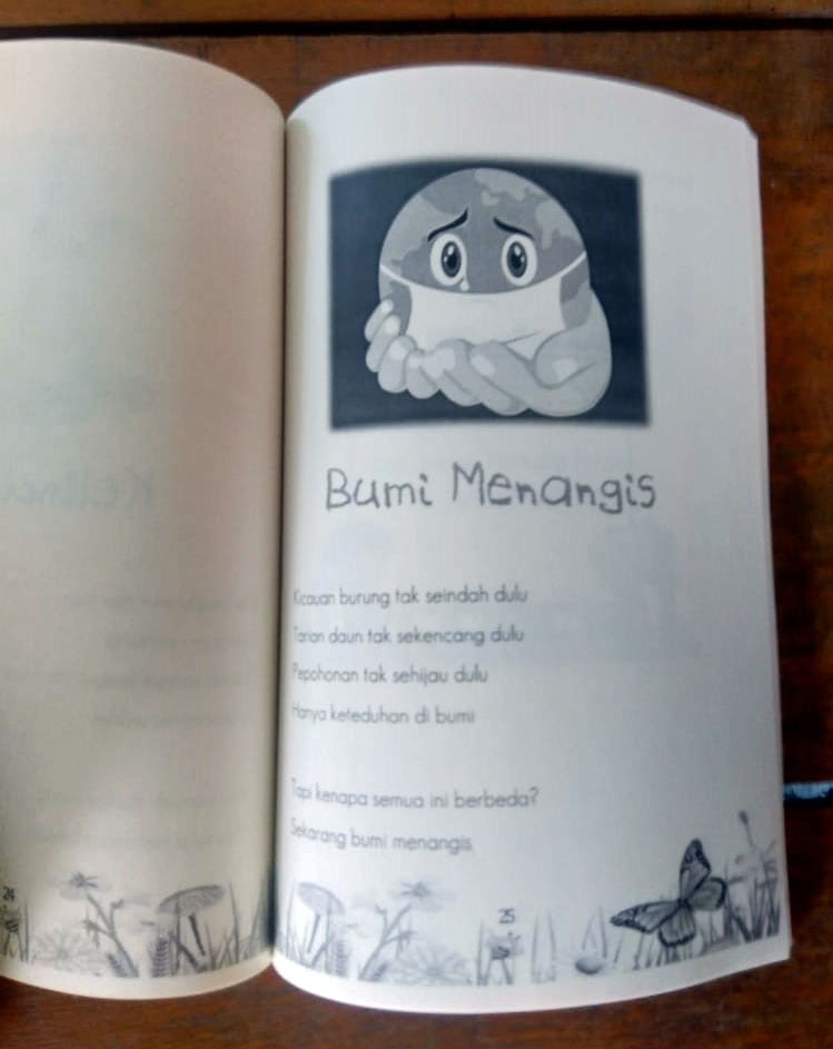 Dengan bahasa yang tegas, Novi Iriyanti(9) mengajak agar: Kita harus bangkit dalam menghadapi Corona yang berbahaya dan bisa mematikan. Ini seolah sindiran terhadap orang-orang yang tak percaya Covid-19 itu nyata adanya. Dengan judul puisi “Bumi Menangis”, Novi ingin berpesan bahwa bumi meradang juga sebab ulah kita yang tak bisa Patuhi aturan yang ada.