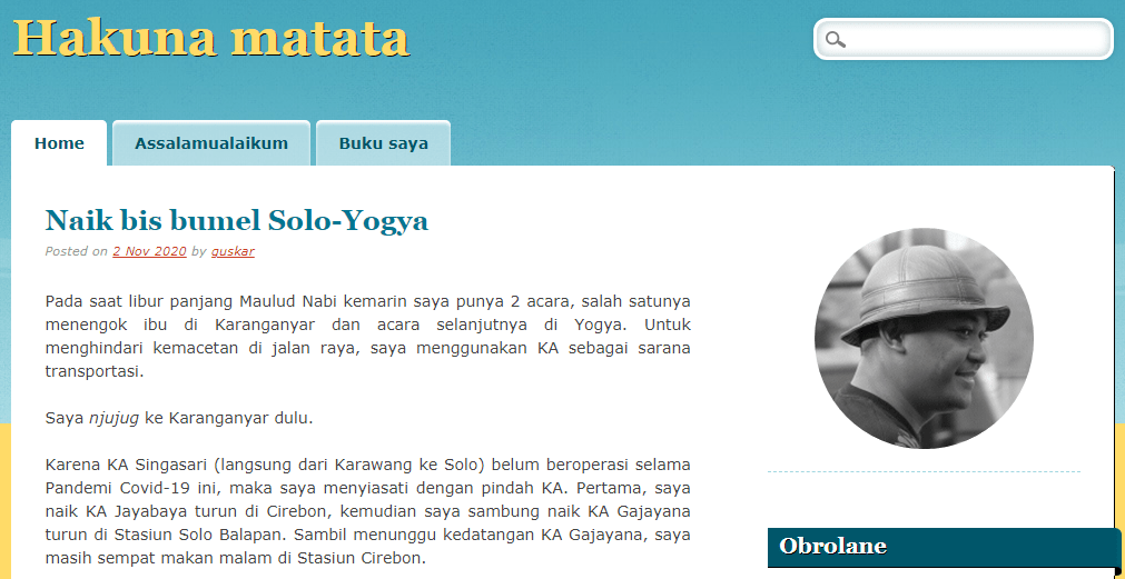 Membaca blog Guskar serasa mengembalikan memori pada blog masa awal, kembali ke khittah sebagai bloger jadul: bercerita tentang apa saja yang mungkin biasa saja sebagai bagian dari diary pribadi. Dari kisah ban mobil kempes di jalan saat mengantar anaknya, menumpang bus ekonomi saat pulang kampung lantaran tak kebagian tiket kereta, dan masih banyak lagi yang menarik.
