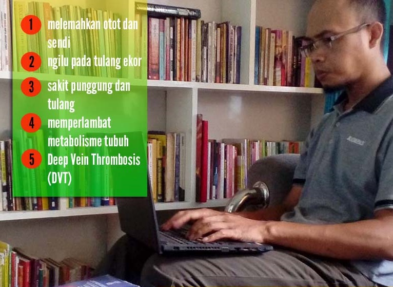 - Kebiasaan duduk lama akan melemahkan otot dan sendi akibat hipokinesia alias kurang bergerak. Bila diteruskan, atrofi otot bisa mengancam yang berujung pada meningkatnya risiko cedera yang tidak kita kehendaki.