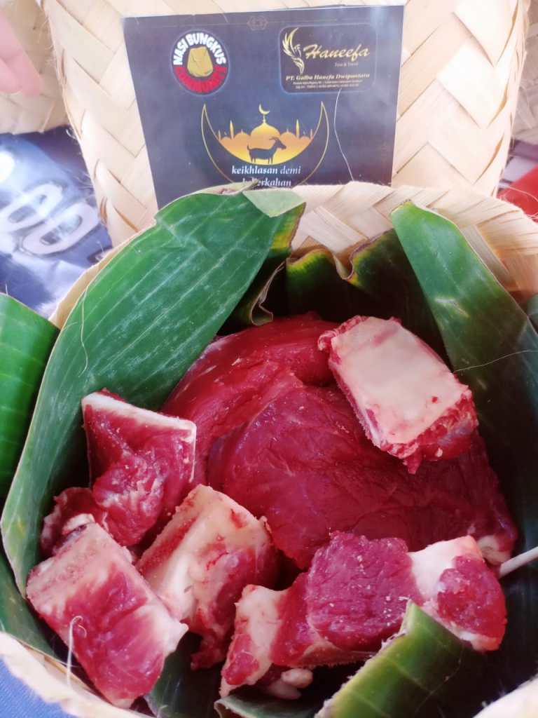 Keren sekali ide membagikan daging kurban dalam besek bambu yang di bawahnya diberi alas daun pisang. Sudah daunnya bisa dijadikan kompos, besek bambunya juga bisa digunakan lagi ya setelahnya.