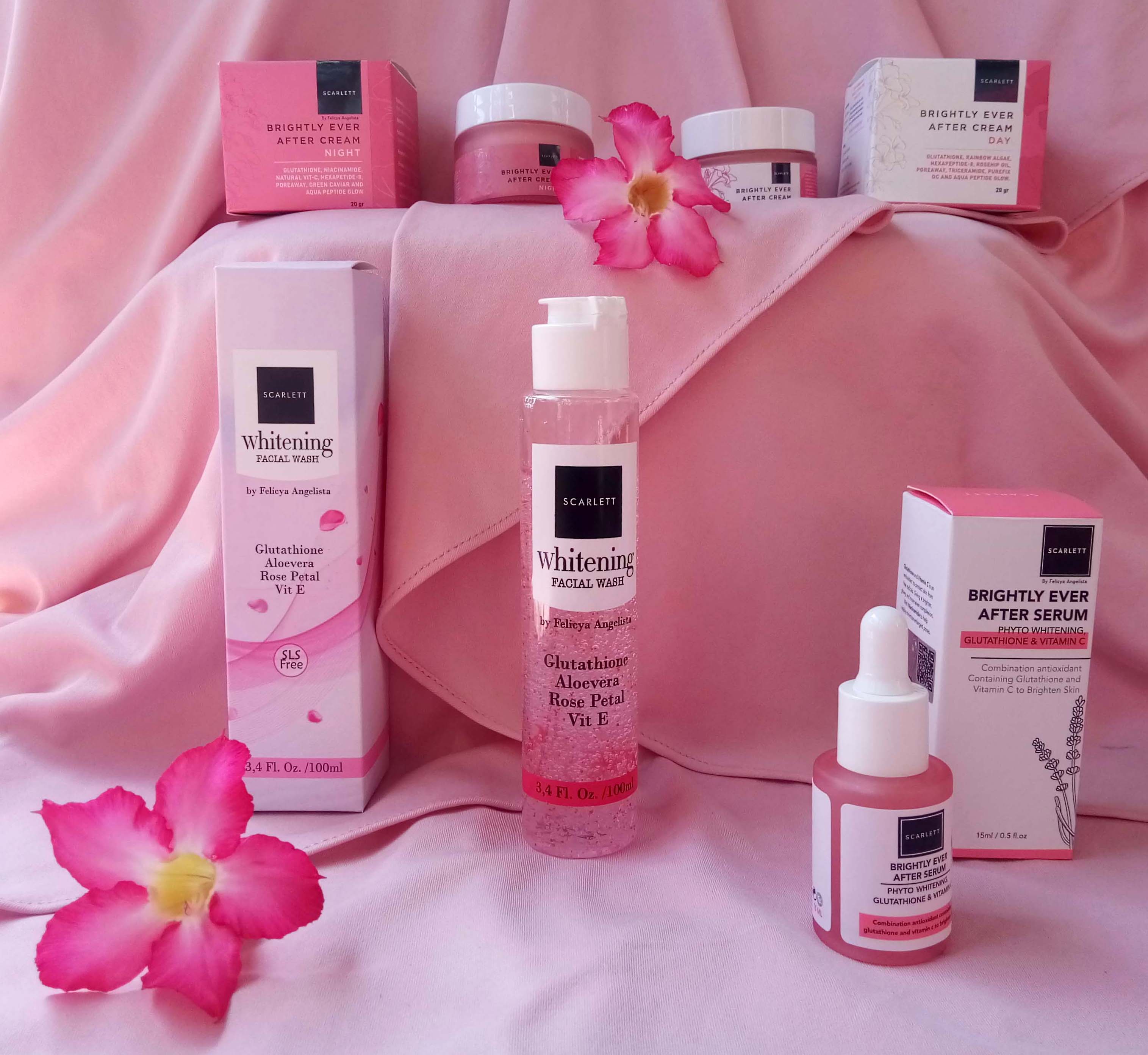 Istri saya memilih produk Scarlett Whitening Face Care Brightly Series yang sesuai dengan jenis kulitnya yang normal. Rangkaian produk yang dipilihnya ada empat macam, yaitu Facial Wash yang berbentuk cair, Brightly Ever After Serum yang berbentuk gel, Brightly Ever After Day Cream yang berbentuk krim, dan Brightly Ever After Night Cream yang juga berbentuk krim.
