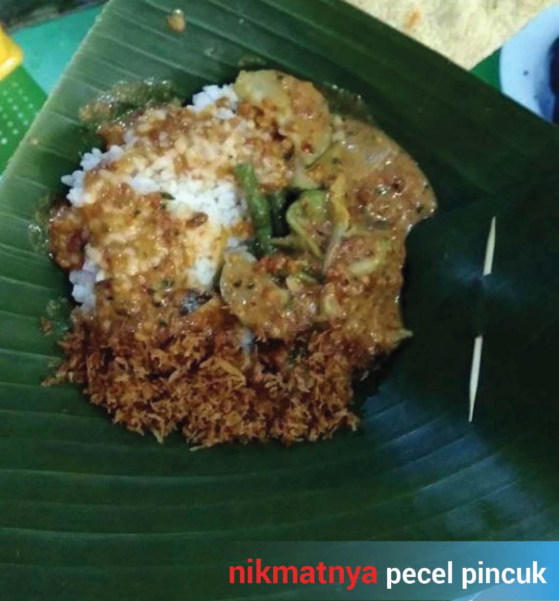 5. Enake mas pecel pincuk e. Jadi lapar. Bau daun pisangnya aja udah khas dan bikin lapar. Aromanya itu lho tak tergantikan. Klo di kampung halaman suami ada yg di pincuk pake daun jati. Uenaaak
