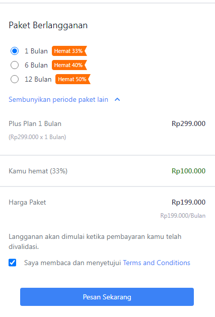 - Tentukan paket yang diinginkan: 1 bulan, 6 bulan, atau 12 bulan. Pastikan memilih sesuai kebutuhan untuk mendapatkan manfaat maksimal. Centang dan klik Pesan Sekarang!