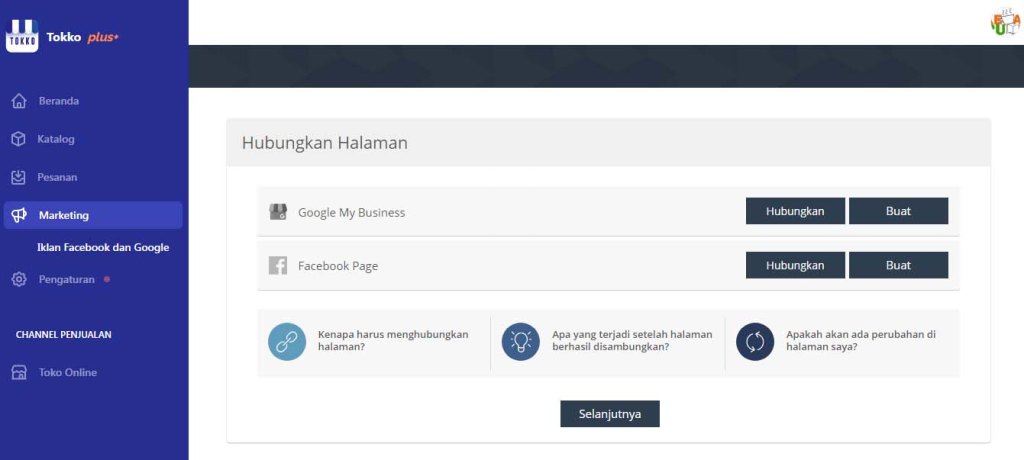- Setelah melakukan pembayaran untuk paket TOKKO Plus, saya segera menghubungkan toko dengan salah satu kanal iklan yang lebih besar yakni Facebook Page. Langkah mudah, tinggal klik fitur Marketing padamenu di sebelah kiri bergambar megaphone.Lalu pilih Hubungkan pada kanal yang kita kehendaki.