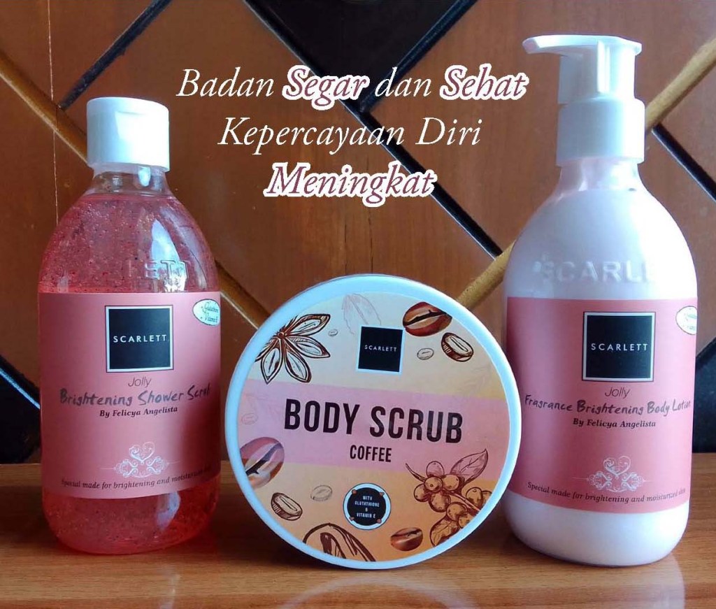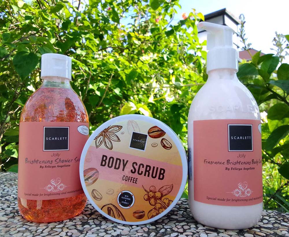 Nah, mungkin ada yang ingin tahu apa saja keunikan rangkaian Scarlett Body Care, berikut akan saya ulas produk Brightening Body Scrub (Coffee), Brightening Shower Scrub (Jolly), dan Brightening Fragrance Body Lotion (Jolly).
