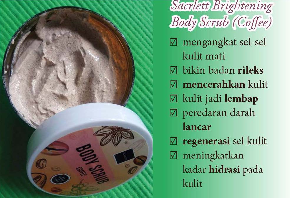 Brightening Body Scrub varian Coffee mengandung Glutathione dan Vitamin E yang memiliki manfaat di antaranya membantu mengangkat sel-sel kulit mati pada kulit tubuh, mampu mengembalikan kelembapan kulit tubuh, membantu mencerahkan kulit tubuh, membantu melancarkan peredaran aliran darah, sebagai sarana untuk rileksasi tubuh, membantu meregenerasi kulit setelah eksfoliasi, dan meningkatkan kadar hidrasi yang dibutuhkan kulit tubuh.