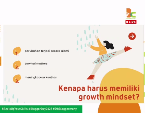 Pada sesi pamungkas Kak Tsurayya psikolog yang tinggal di Palembang mengingatkan kami untuk memiliki growth mindset. Dengan growth mindset kita akan sadar bahwa perubahan itu niscaya sehingga kita terdorong untuk memiliki survival skill dan terus meningkatkan kualitas diri.