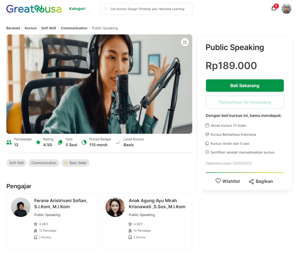 Keunggulan keempat belajar melalui GreatNusa adalah profil pengajar yang ditampilkan secara gamblang dengan kompetensi yang sesuai. Inilah yang kita butuhkan, instruktur yang qualified. Dengan harga tak sampai 200 ribu rupiah, kita akan dipandu oleh para pengajar profesional sesuai bidangnya. Mereka adalah ahli komunikasi sebagaimana bisa kita cek pada rating masing-masing.