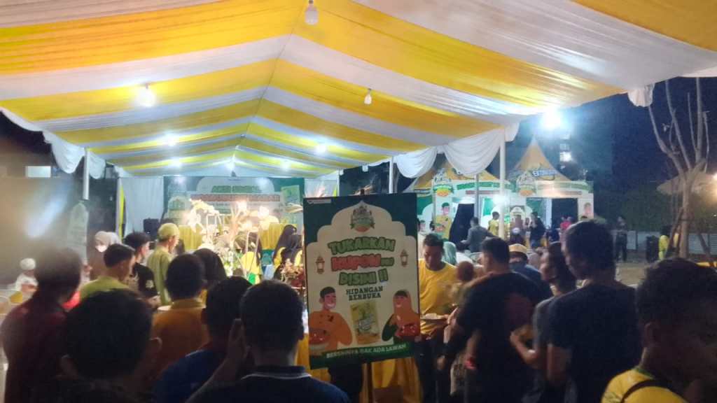 Rampung magriban, kami bergegas merapat ke lokasi sesuai arahan. Di sana terlihat tenda warna kuning hijau yang ternyata didukung sepenuhnya oleh produk cuci piring Ekonomi Liquid. Ya, malam itu jamaah dari berbagai sudut Lamongan–bahkan mungkin musafir kota lain–dijamu dengan istimewa oleh produk andal di bawah Wings Food ini.