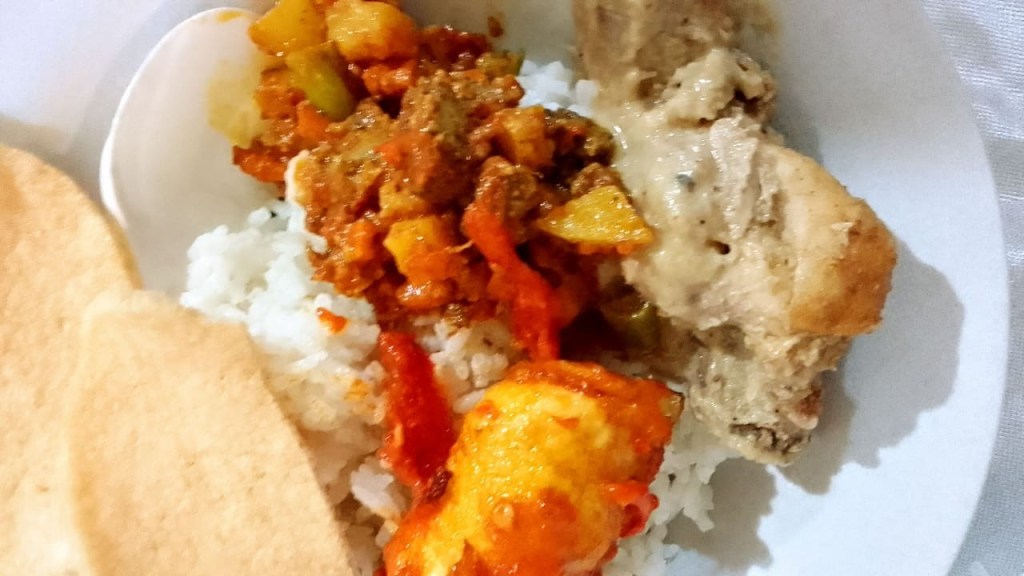 Menu yang dihidangkan malam itu sungguh menggugah selera. Nasi ambil sendiri, lalu petugas membubuhkan ayam opor, sambal goreng ati, dan telur balado yang semuanya lezat. Kami beringsut dari satu meja ke meja berikutnya untuk menerima lauk, termasuk selembar kerupuk udang dan segelas air mineral.