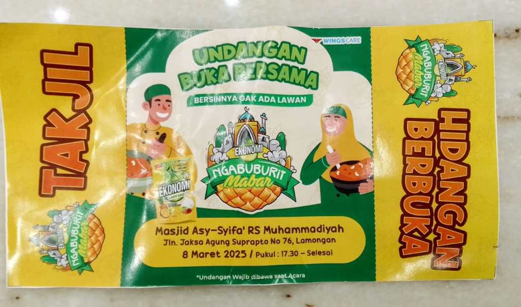 Alih-alih kartu seperti biasa, sore itu kami menerima lembaran tipis semacam stiker. Bentuknya cukup lebar dibanding kartu harian, dengan desain meriah dan dominan warna kuning hijau. Saya tak terlalu memperhatikan detailnya, hanya tertulis teks Takjil dan Undangan Berbuka. “Paling juga sama kayak biasanya, hanya beda kupon,” bisik saya lirik kepada Bumi saat mendengarkan kajian.