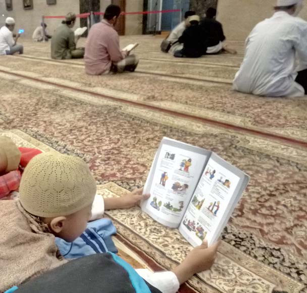 Satu anak kelas 3 SD, sebelahnya yang berambut panjang naik kelas 1, dan satu lagi siswa kelas 6. Sewaktu asyik baca buku, isenglah saya ajukan beberapa pertanyaan seputar pengetahuan umum, termasuk sejarah perjalanan nabi-nabi. Mereka sebenarnya antusias, tetapi jelas kurang tangkas sebab bacaan yang selama ini sangat terbatas.